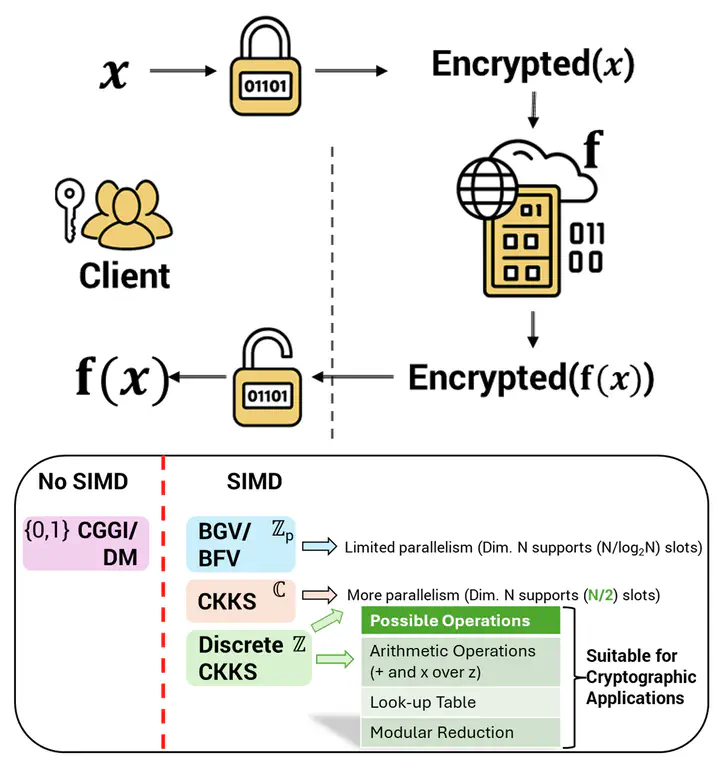 Fully Homomorphic Encryption (FHE)—cryptography’s holy grail that enables secure computation on encrypted data without decryption. This technology resolves the fundamental tension between data utility and privacy, with applications spanning cloud computing, AI, and secure data analysis. What makes this direction particularly compelling is that FHE schemes share mathematical building blocks with lattice-based post-quantum algorithms, allowing me to leverage components and insights from my PQC research.